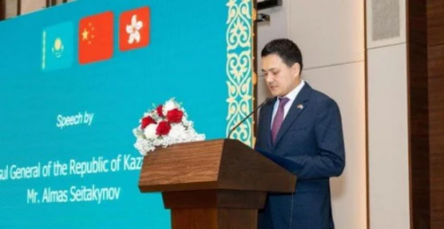 4月21日,哈萨克斯坦-香港商贸论坛在屯门黄金海岸酒店举行。出席活动的嘉宾有哈萨克斯坦总领事Mr. Almas Seitakynov 、商经局副局长陈百里JP,中联办新界工作部邓灿辉处长、屯门民政专员冯雅慧JP、新界社团联会副理事长云天壮MH、屯门欣田区区议员赖嘉汶议员、中国香港国际商贸总会郑长荣会长等。在活动的致辞中,哈萨克斯坦总领事及其领事馆要员简介了哈萨克斯坦的地理环境,强调了该国在历史、文化、经济以及科技方面的丰富成就。同时亦欢迎各位到哈萨克斯坦投资经商及旅游感受当地文化。