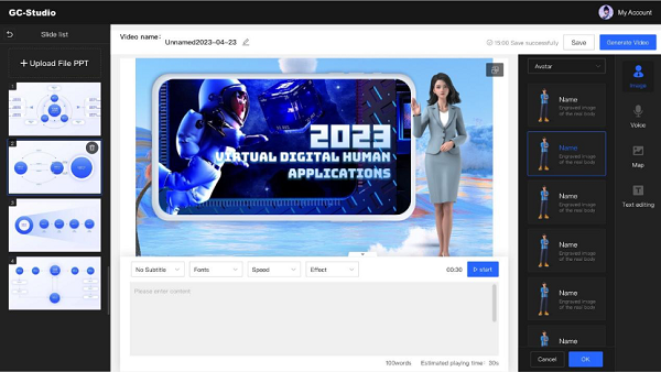GC-Studio通过最大限度减少传统视频制作的人工介入,有效降低使用门槛、提升交互体验,大幅节约了人力资源和物力消耗。企业只需设置数字人参数,即可获得一个适合公司形象的、专业的、可24小时无间断工作的数字讲解员。
