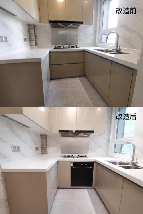 老板电器“无忧厨改”项目洗碗机改造效果,(上)改造前,(下)改造后