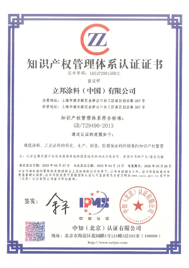 有力支持全面创新”为主题的2023年全国知识产权宣传周活动[1]正如火如荼地进行。作为创新驱动型企业,立邦始终注重知识产权的管理和保护,以此保障严谨的技术研发工作,稳步提升自主创新能力。近日,立邦顺利通过国家知识产权管理专业机构评审,再次获得《知识产权管理体系认证证书》,为自身进一步规范知识产权管理,增强核心竞争力打下了坚实的基础。