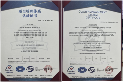 近日,经专业认证机构中泰智联(北京)认证中心有限公司一系列严格的审查考核,北京随信云链科技有限公司 ( 下称:随信云链 ) 凭借 优秀的质量管理体系在应用软件开发及运维服务领域,成功获得ISO9001: 2015国际质量管理体系认证。