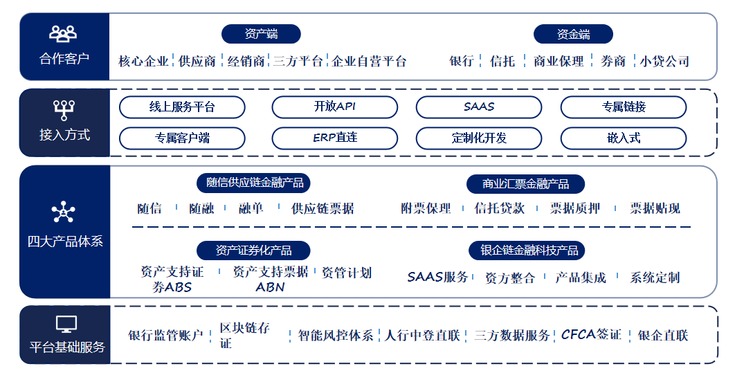 基于深度洞察,随信云链从2018年开始正式拓展供应链金融业务,在结行科技集团金融科技、自有资金和链接资源的加持下,运用区块链、大数据、云计算、人工智能等金融科技力量构建产业金融生态、创新商务合作模式、建立支付级智能风控体系、提供全生命周期管家式服务, 持续突破发展瓶颈,打通产业链信用壁垒,实现核心企业商业信用赋能。