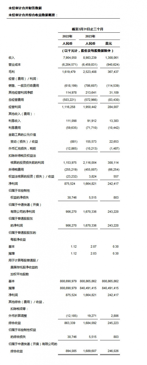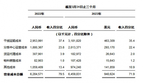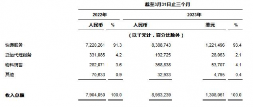 收入总额 为人民币8,983.2百万元(1,308.1百万美元),较2022年同期的人民币7,904.1百万元增长13.7%。核心快递服务收入较2022年同期增长16.1%,该增长是由于包裹量增长20.5%及单票价格下降3.7%的综合影响所致。货运代理服务收入较2022年同期减少41.8%,该减少主要是由于全球经济疲弱导致跨境电商需求和定价下降所致。物料销售收入主要由打印电子面单所需的热敏纸销售收入组成,同比增长30.8%,该等增长与包裹量增长趋势吻合。其他收入主要由金融贷款业务组成。