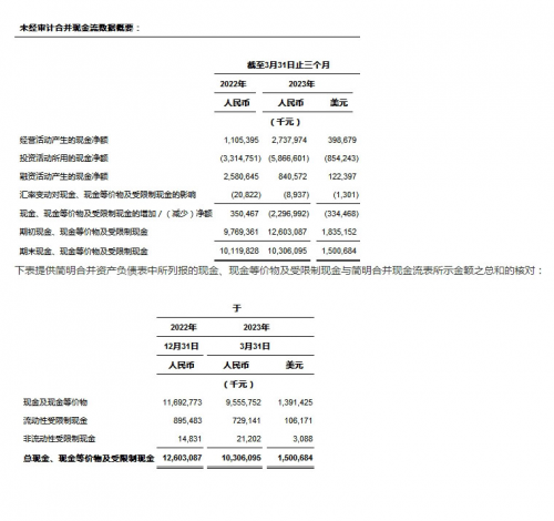 • 经营活动产生的现金净额为人民币2,738.0百万元(398.7百万美元),而2022年同期为人民币1,105.4百万元。