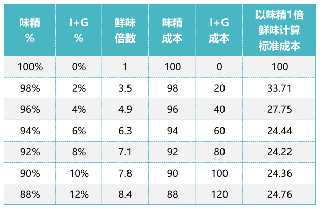 I+G与味精搭配的鲜味呈味倍数成本对照表