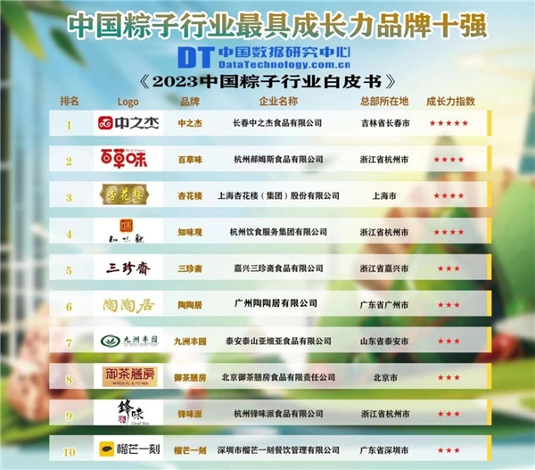 6月14日,中国数据研究中心发布“2023中国粽子行业最具成长力品牌十强榜”,中之杰跻身榜单第一名,上榜的还有百草味、杏花楼等知名粽子品牌。