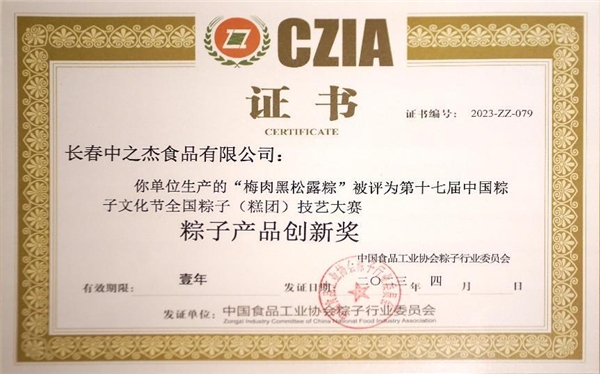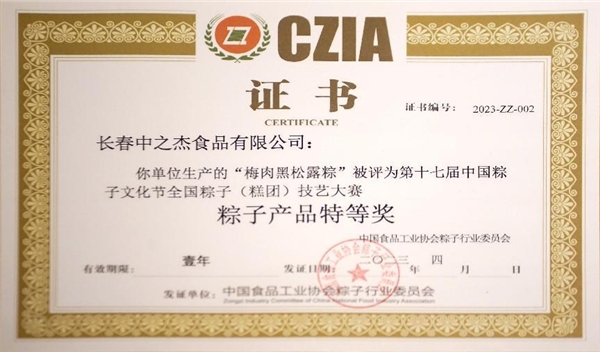 2023年4月19日,中之杰再次惊艳亮相中国粽子文化节,一举斩获三项全国大奖。中之杰的梅肉黑松露粽作为创新产品,从原料、工艺、口感、颜值等各个方面都受到行业专家推崇,同时斩获全国(糕团)技艺大赛双冠王——大赛最高奖项“粽子产品特等奖”和“粽子产品创新奖”,中之杰海盐芝士炸不爆元宵荣获全国(糕团)技艺大赛最高奖项“糕团产品特等奖”。