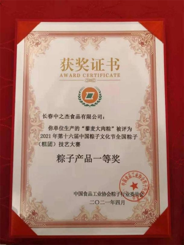 2021年,由中国食品行业协会举办的第16届中国粽子文化节颁奖仪式上,中之杰“藜麦大黄米粽”获得最佳创新奖、“藜麦大肉粽”获得一等奖、“藜麦大黄米汤圆”获得特等奖,可谓是满誉而归。并且这已经是中之杰在中国粽子文化节上连续5年蝉联最高荣誉。