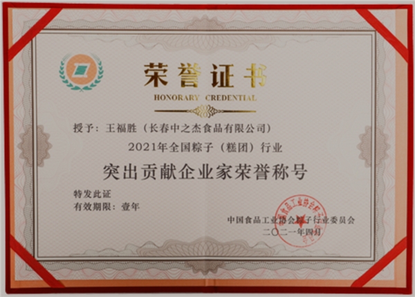 有鉴于中之杰长久以来对弘扬粽子文化事业的贡献,在2021年,中之杰董事长王福胜先生获得机构颁发的“突出贡献企业家”称号,体现出中之杰在行业内的领军实力和顶流水平。王福胜还带领中之杰分别荣获 “长春民营经济突出贡献企业”和“民营经济突出贡献企业家”等荣誉。同时,王福胜还担任中国食品工业协会粽子行业委员会会长职务,为行业发展尽职尽责。