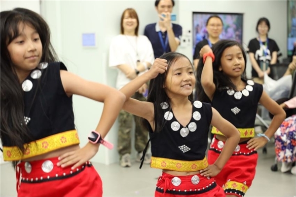 在后续的活动中,孩子们向企业志愿者们展示了他们各民族的才艺。来自佤族的孩子向志愿者们展现了传统的甩发舞,佤族人民以长发为美,佤族姑娘们伴随着鼓点鲜明的音乐,甩动起来的长发就像飘着的一块块黑绸缎,飘逸大气,野性十足,自信展现着本民族独特的文化魅力。来自纳西族的孩子们带着志愿者认识他们的传统文字——东巴文,这是世界上唯一一种还在使用的象形文字,距今已有1200多年的历史。志愿者们借助形象的图像表达认识了东巴文中的十二生肖动物文字,并和孩子们一起体验“东巴十二生肖”桌游,在充满民族文化内涵的益智游戏中,沉浸式感受纳西族的智慧。各族青少年和企业志愿者们玩闹在一起,活动会场内回荡着大家的歌声、笑声。