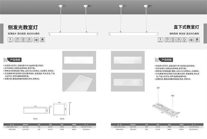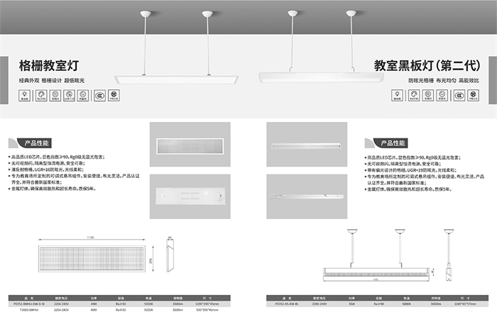 其中,LED UGR教室灯设计轻薄,造型简约,能够让教室焕然一新;LED直下式教室灯采用微棱镜扩散板,发光均匀柔和;LED格栅教室灯采用格栅面板设计,光线均匀柔和;LED黑板灯采用漫反射型光栅,高光效,低能耗。