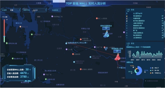 针对家装MALL市场,家装MALL为交点,结合家装MALL周边室分站负载信息,统计其实时人流情况,并利用B域数据对用户画像进行刻画与分析,进行可视化展示,助力家装市场商机挖掘,赋能精细化、个性化精准营销。