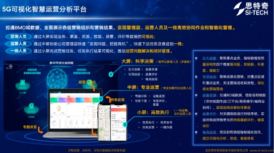 作为数智化转型的使能者、赋能者、运营者,思特奇始终走在数智化探索前列,凭借丰富的5G营销技术积累和商用经验,全力支撑运营商可视化精准营销业务发展。经过对全国各地省会城市的深度调研,思特奇研发设计出5G可视化智慧运营分析平台,以实现数据运营可视、目标过程管控、一线环节触达、评价量化标准为目标,聚焦业务问题,通过数据-问题-结果-反馈进行闭环分析复盘,加快运营商公司平台型、数字化、智能化、生态化转型。