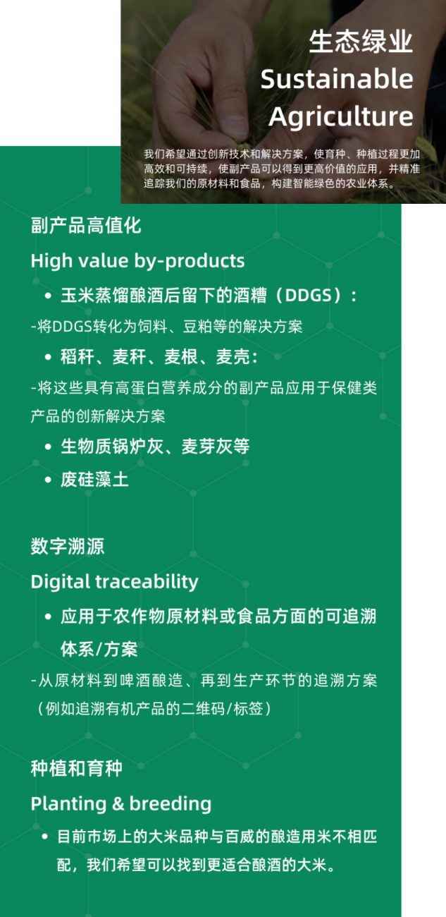 每一年,100+创新中心都会在价值链上梳理亟待解决的可持续发展挑战议题并公开招募创新解决方案,目标是让你的想法得到验证并实现商业化应用,在试点完成后能够获得更大的商业合同,与百威中国以及更多伙伴建立强有力的合作。