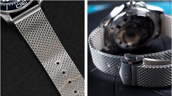 海马300米“詹姆斯·邦德60周年纪念款”腕表可配备网状表链或者NATO表带。自从2019年,欧米茄海马300米“007无暇赴死”开始,网状表链和NATO表带开始进入到海马300米系列中。特别是网状表链和海马300米表头组合,在增强复古风格的同时,已经成为了欧米茄海马300米特殊款的一大特征,具有极高的识别度。