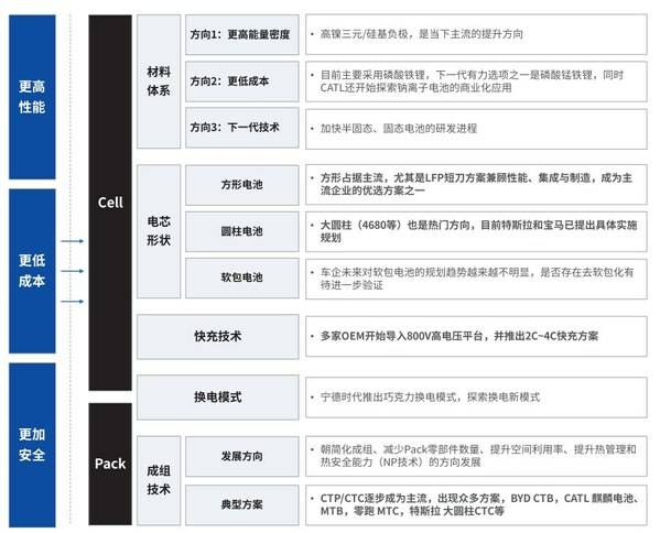 材料从根本上决定着电池性能。通过改进材料提高电池性能、优化电池老化机制、应用新型材料、改变电芯结构是电芯研发的主要方向。 例如,材料体系方面,采用新型材料体系(高镍正极、硅基负极、锂金属负极、固态电解质等),提高单体能量密度;或者研制出磷酸锰铁锂,探索钠离子电池的商业化应用,降低成本;或者加快固态电池的研发进程,使电池性能更高,更耐久。电芯形状方面,方形电池,尤其是LFP短刀兼顾性能、集成与制造,成为主流企业的优选方案之一;大圆柱电池也是热门方向,特斯拉和宝马均已提出具体的实施规划。快充技术方面,多家主机厂开始导入800V高电压平台,并联合电池企业推出2C~4C快充方案。