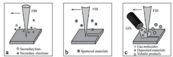 FIB-SEM示意图,与聚焦离子束的三种工作模式 a.成像;b.加工;c.沉积 来源:蔡司,NE时代整理