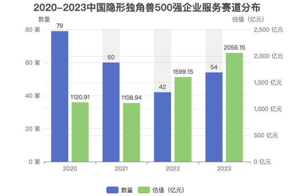 报告显示,2023中国隐形独角兽500强企业服务赛道独角兽企业有54家,估值合计为2059.15亿元(如上图)。根据BIHU创业伯乐独角兽企业数据库(EMUDB),2021-2023中国隐形独角兽500强企业服务赛道隐形独角兽企业同比分别减少19家、减少18家、增加12家;企业服务赛道隐形独角兽企业估值合计同比分别降低1.07%、增长44.21%、增长28.77%。2023年与2022年相比,企业服务赛道隐形独角兽企业从42家上涨到54家,增加了12家,涨幅为28.57%,呈现出上升趋势;估值合计从1599.15亿元上涨到2059.15亿元,增长了460亿元,涨幅为28.77%,呈现出上升趋势。