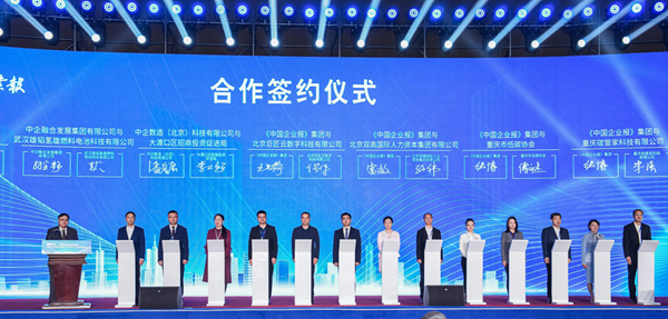会议还举行了集中签约仪式。《中国企业报》集团与航天科工海鹰集团有限公司、北京巨匠云数字科技有限公司、北京双高国际人力资本集团有限公司、重庆市低碳协会、重庆碳管家科技有限公司,中企融合发展集团有限公司、武汉雄韬氢雄燃料电池科技有限公司,中企数造(北京)科技有限公司与大渡口区政府分别举行了合作签约仪式。下一步,《中国企业报》集团将与签约各方进行深入长期的合作,为促进产业升级发展和政企互动合作夯基础,建平台,增动力。