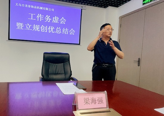 5月18日,义乌市圣菲饰品机械有限公司在3楼会议室召开2023年度工作务虚会暨立规创优行动总结会,生产部经理谢时姣和班组长及以上管理人员参加。与会人员逐一发言,汇报了各部门今年以来在政治思想工作和整治立规专项行动方面所取得的成绩以及需要改进的方向。会议由行政部经理吴吉红主持,公司法人代表、“圣菲先锋号”顾问梁海强到会作中心发言。
