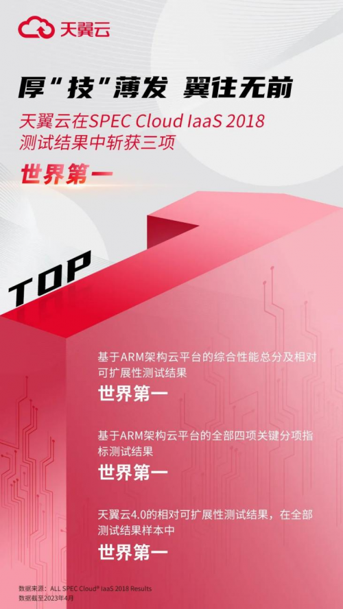 测试结果,天翼云平台在综合性能及平台相对可扩展性比拼中夺得世界第一。在9台组规模测试、ARM指令集架构测试场景中,天翼云平台的测试结果一举刷新世界纪录;应用实例复制数、相对可扩展性和平均实例配置时间等指标均达到全球领先水平,充分体现天翼云平台优秀的算力调度能力和大规模扩展能力。