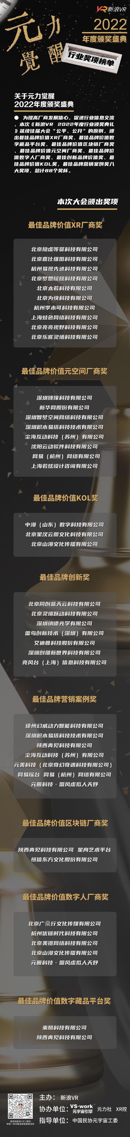 为提高厂商发展信心,促进行业信息交流,本次《新浪VR 2022年度行业颁奖典礼》延续往届大会“公平、公开”的原则,颁出最佳品牌价值XR厂商奖、最佳品牌价值数字藏品平台奖、最佳品牌价值区块链厂商奖、最佳品牌价值元空间厂商奖、最佳品牌价值数字人厂商奖、最佳创新品牌价值奖、最佳品牌价值KOL奖,最佳品牌营销案例奖八大奖项,总计44个数字奖杯。