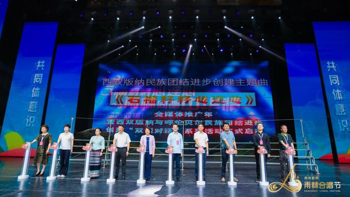 开幕式上,南疆与北疆,西双版纳与呼伦贝尔,以“中华民族一家亲,同心共筑中国梦”为总目标,以首届西双版纳雨林合唱节为契机,开启两地“双城(民族团结)对话”,打造“民族团结+文化旅游”创新发展模式。中共西双版纳州委副书记、州委统战部部长王嘉玲等领导为“西双版纳民族团结进步创建主题曲《石榴籽籽心连心》全媒体推广年、西双版纳与呼伦贝尔民族团结进步创建“双城对话”系列活动”进行了创意启动。