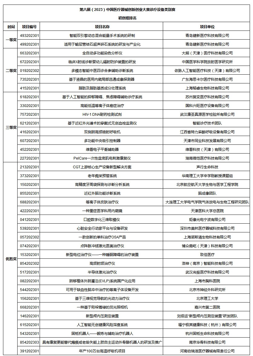 诊疗设备类别赛初创组最终评选出一等奖2个,二等奖5个,三等奖8个,优胜奖21个。