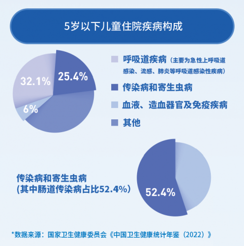 调查报告也显示,0-14岁儿童住院病人中,5岁以下儿童占比65%,而住院疾病构成中,呼吸系统疾病和肠道传染病总体占比近50%,为住院疾病负担主因。如何提高儿童免疫力,成了保障儿童健康的关键因素。