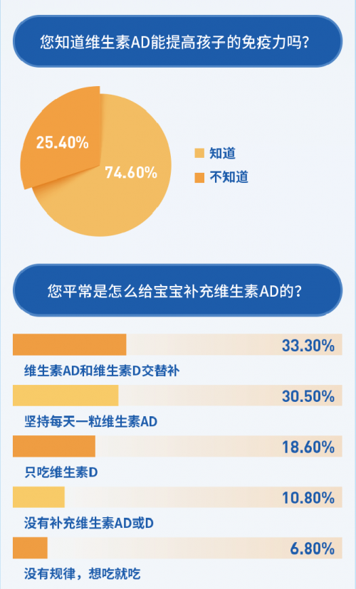 调查报告还显示,虽然7成的家长认可维生素AD对提高免疫力的作用,但有7成的家长用错了方法,比如选择AD和D交替补、只补D不补A、补补停停等。专家提醒,家长一定要重视孩子日常营养的摄入,坚持每天补充维生素AD是最佳方案。