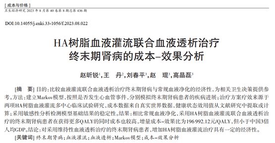 8月1日,国家卫生健康委卫生发展研究中心、国家药物与卫生技术综合评估中心赵琨研究员等的研究成果《HA树脂血液灌流联合血液透析治疗终末期肾病的成本-效果分析》发表于《卫生经济研究》杂志。