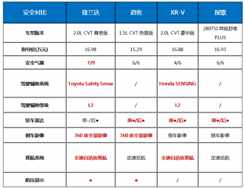 而在主动安全配置上,四款车型中仅有2款提供了选择,分别为锋兰达搭载的T-PILOT智能驾驶辅助,以及XR-V的Honda SENSING驾驶辅助系统,两车的功能性方面均满足L2级的自动驾驶。并且两车的主动安全都近乎实现全系标配,这也让购车的消费者不用过多在主动安全以及更高的预算上左右为难。
