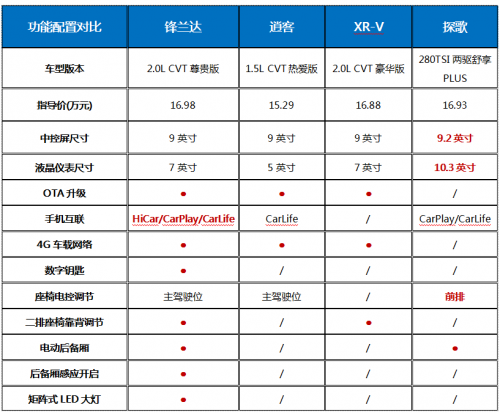 根据配置表现来看,四款车型均配置了液晶仪表、手机互联等基础智能化配置均实现了搭载,但在功能性、配置丰富度上,以锋兰达以及探歌的优势尤为明显。其中以锋兰达为例,车辆采用了9英寸中控屏+7英寸液晶仪表的组合,并且还支持HiCar/CarPlay/CarLife三大平台的手机互联,基本满足了当下95%以上的手机车机互联需求,并且锋兰达提供的4G车载网络大大拓展了车机系统的功能性与娱乐性,而OTA远程升级则能够保证车机系统的常用常新。