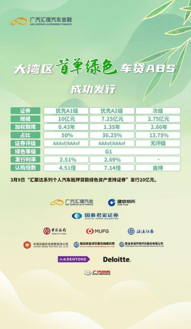 与此同时,广汽汇理良好的绿色金融资产也获得了资本市场的认可。今年3月9日,广汽汇理发行了粤港澳大湾区首单绿色车贷ABS——汇聚达2023年第一期个人汽车抵押贷款绿色资产支持证券。本次入池资产均为广汽埃安品牌新能源汽车个人贷款,经绿色认证机构联合赤道评估分析,入池资产对应的新能源汽车,预计每年可实现二氧化碳减排6.07万吨,节约标准煤2.85万吨,有效地助力了我国节能减排事业开展。