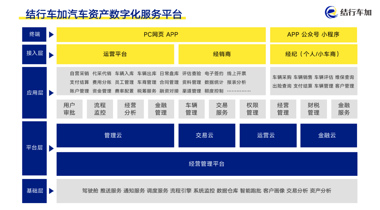 结行车加汽车资产数字化服务平台包含数智管理、数智运营、数智服务、数智金融四大功能,能为客户提供联合采购、财税管理、报表管理、金融服务、风控审批以及车辆评估、维保查询、线上开票等实用增值服务,可为二手车交易从业者搭建标准化、线上化、数字化、智能化基础设施,快速提升车企经营水平,实现降本增效、优化资源配置。