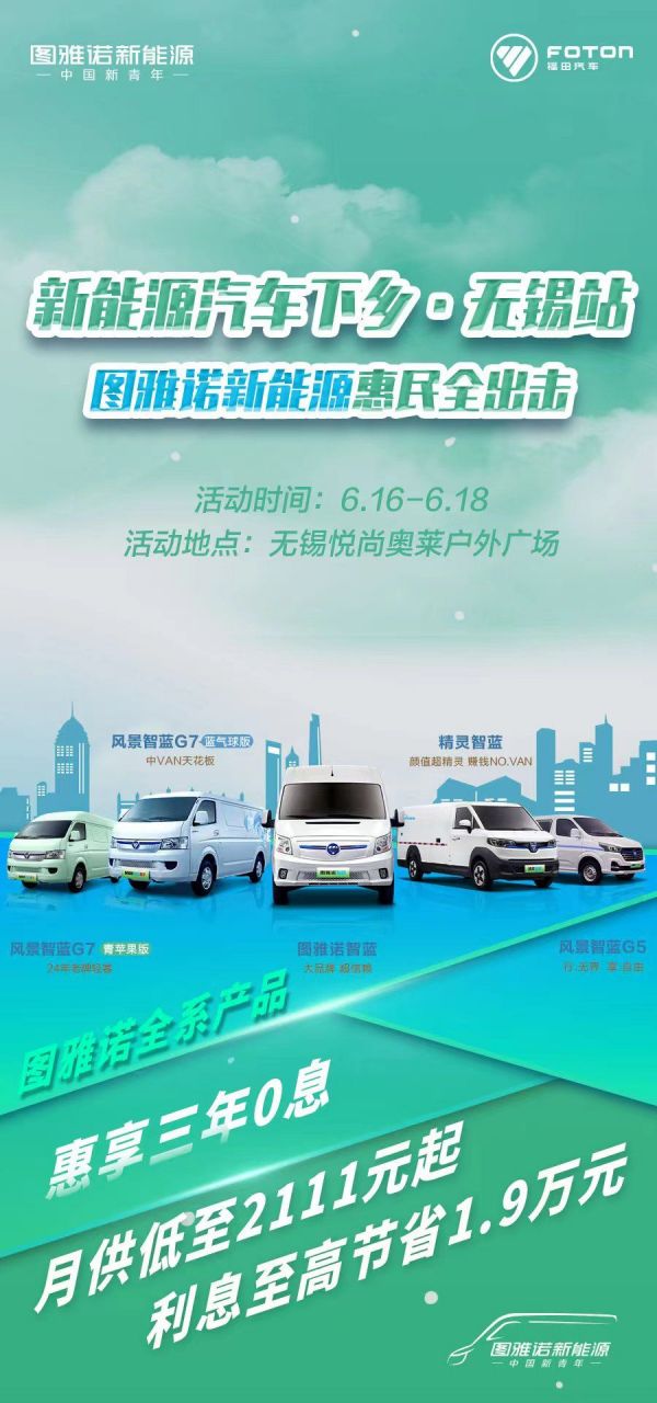 6月16日,2023年全国新能源汽车下乡启动仪式在江苏无锡惠山盛大召开,福田图雅诺携风景智蓝G7和精灵智蓝E7强势亮相,展示创新成果和实体经济的深度融合,助力乡村振兴,为生态可持续发展贡献力量。