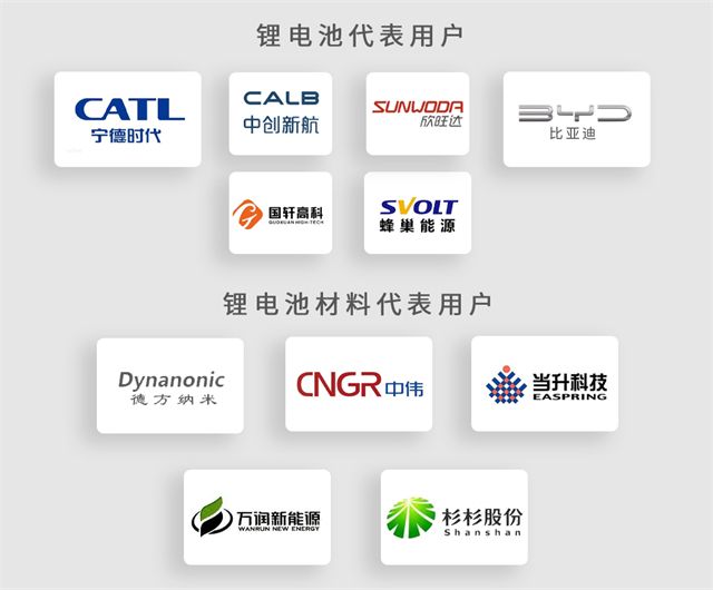 锂电池企业:宁德时代 ,比亚迪 ,中创新航,国轩高科,欣旺达,蜂巢能源等。锂电材料企业:德方纳米,中伟股份,当升科技,湖北万润,杉杉股份等,均为我公司长期用户。