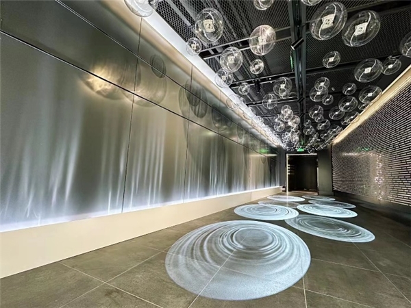 【水影】长廊通过水滴挂坠、涟漪投影及名言墙打造沉浸式光影体验