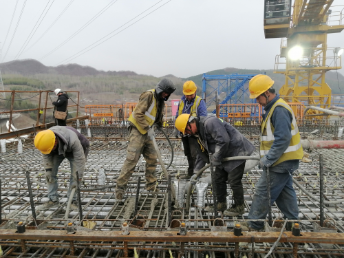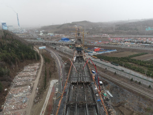 图为沈白高铁建设中的白山浑江特大桥,该桥是全线控制性工程,全桥长1499.5米,全桥共有钻孔桩588根,桥墩台56个,大跨度连续梁3个,道岔连续梁1个,正在浇筑混凝土的是道岔连续梁和10号墩0#块。该桥先后跨越浑江、辉临高速公路及G201国道,涉临近铁路既有线施工,安全风险高,施工难点多。