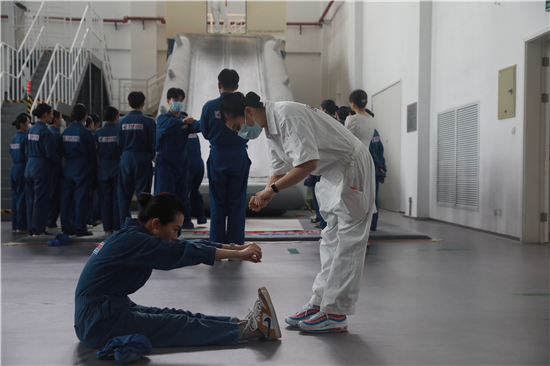 教员正在协助学员王思捷使用正确姿势做跳滑梯准备