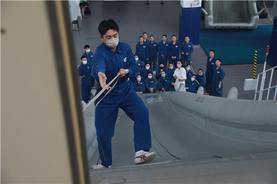 连日来,位于上海市青浦区、承担空勤队伍培训业务的东航研发中心一片繁忙。无论周一到周五还是周末,实操训练教学区域里,口令呼叫声、设备运转声、水上区域学员的跳水声……始终不绝于耳。在6月,东航研发中心的周末训练场次全部排满,并加开了下午6点到晚上9点的培训班。来自东航研发中心的信息显示,东航乘务新员的训练周期约66个工作日,通过利用周末时间、优化培训效率的安排,当前的新乘学员大多将在7月中旬结业,完成初始训练的学员随后将在航班旺季加入带飞训练,预计最早能在8月独立保障航班。乘务新员们也都期待着早日结业、飞向蓝天的那一天。
