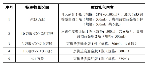 根据活动安排,吉宏股份持股25万股以上的股东收到的白酒礼包将包括:飞天茅台1瓶(规格:53% vol 500ml)、遵义1935酱香型白酒1瓶(规格:500ml)、贵州酱酒品鉴版1件(规格:500ml,共6瓶)。