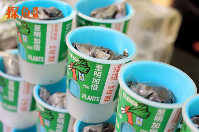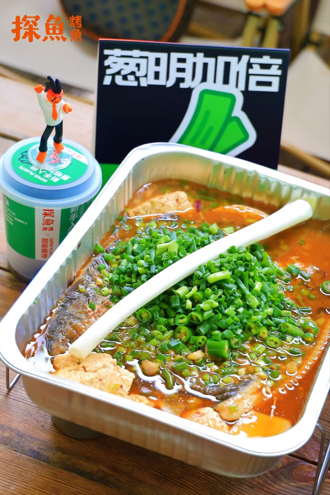 在产品研发上,探鱼也充分考虑了顾客在感官、味觉、互动等多方面的场景体验,最新推出的“鲜青椒葱葱烤鱼”就充分体现了这一点。鲜青椒葱葱烤鱼在创新理念上,是探鱼招牌口味“鲜青椒爽麻烤鱼”口味的味型升级,在藤椒口味的基础上增加时令性的葱香风味,一经推出,就颇受大众喜爱。据悉,新品上市7天,已经比去年同期上新的烤鱼销量上涨105%。在产品呈现上,新品上餐时配上一整棵鲜甜大葱,然后由服务人员现场进行“剪葱仪式”,将葱段下入锅内,提味增香,同时为消费者营造一种新奇特的体验感。除此之外,探鱼借势本次上新,与最近大热的植物品牌“超级植物公司”联名推出可以种出小葱的“葱明种子卡”,不仅深化葱的产品主题,还收获了目标客群“打工人”的情感共鸣。