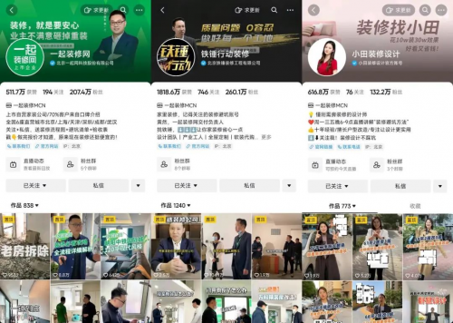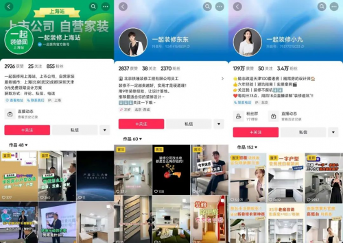 因此,在确定了以解决业主在家装过程中的痛点问题为主要目标后,一起装修网在抖音搭建了多城市、针对细分赛道、具有不同人设风格的IP账号矩阵,同时进行矩阵差异化运营。