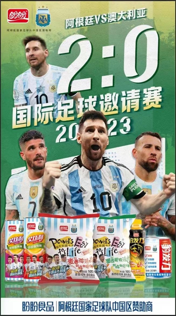 6月15日,万众瞩目的2023北京阿根廷vs澳大利亚国际足球邀请赛在北京工人体育场正式开打。梅西开场仅81秒率先进球,带领阿根廷队最终以2比0战胜澳大利亚队,阿根廷队以他们顶级的技术水平和默契的团队合作,折服了现场数万观众。盼盼食品作为阿根廷队的官方赞助商,热烈祝贺阿根廷队在亚洲巡回赛首战告捷!