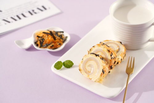 盼盼肉松海苔戚风卷,不愧是盼盼食品深耕烘焙产品的又一力作!外面满满的一层肉松与海苔,这绝妙搭配,让整块蛋糕卷的风味更上一个台阶!恰到好处的咸香口味,中和了甜点本会有的甜腻。第一眼看到松软又带有淡淡油润的肉松上铺着微脆的小片海苔,松软鲜香,好吃又不腻,让人忍不住深入挖掘,一探究竟!