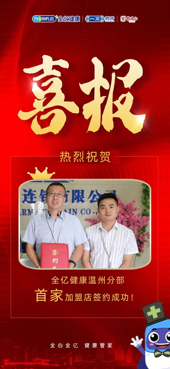 继7月3日,全亿健康温州分部并购三德34家门店之后,全亿健康再传喜报,在7月12日第一家加盟店成功签约!并购、加盟、自开,三驾马车并驾齐驱,进一步提升全亿健康在温州的影响力!