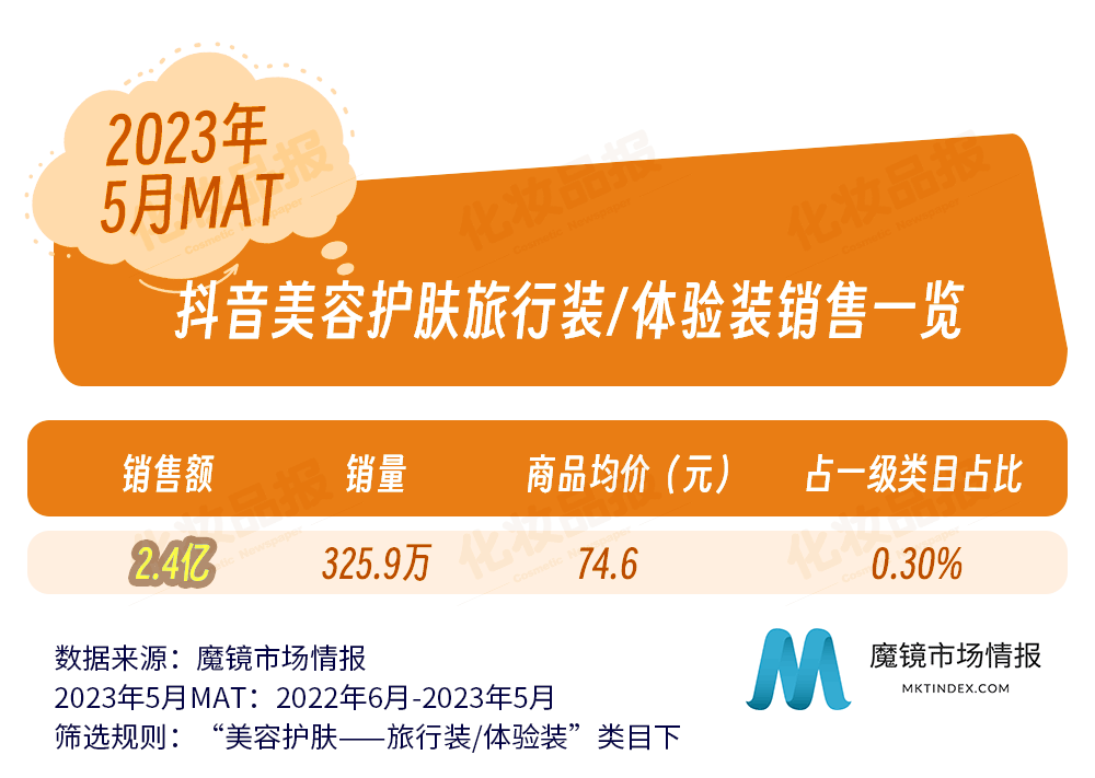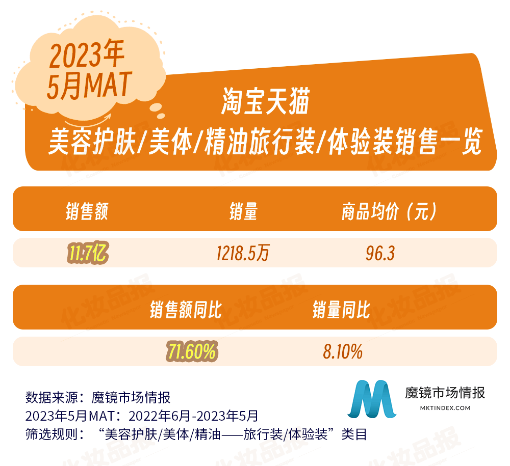 近日,国内零售洞察公司魔镜市场情报发布了一份关于化妆品旅行装/体验装在各主流电商平台的销售调研报告。报告统计的类目主要针对彩妆、香水、美妆工具、美容护肤、美体和精油类旅行装/体验装,统计调查的平台涵盖淘宝、天猫、抖音等,统计周期为2022年6月-2023年5月。