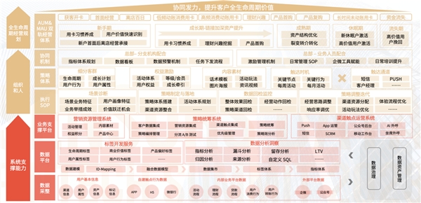 上图为数字化经营能力全景图,最上层为全生命周期经营规划,即 AUM&MAU 双轨经营体系,包括不同阶段的主要运营目标,如新手期主要为用卡习惯养成、用户价值快速识别、新户首面后离店经营继承等。