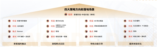 • 业务策略:匹配业务特点和经营目标的经营策略体系,不同业态的业务策略和场景不同,可尝试创新的点也不同;匹配业务与客群特点的渠道定位和场景建设